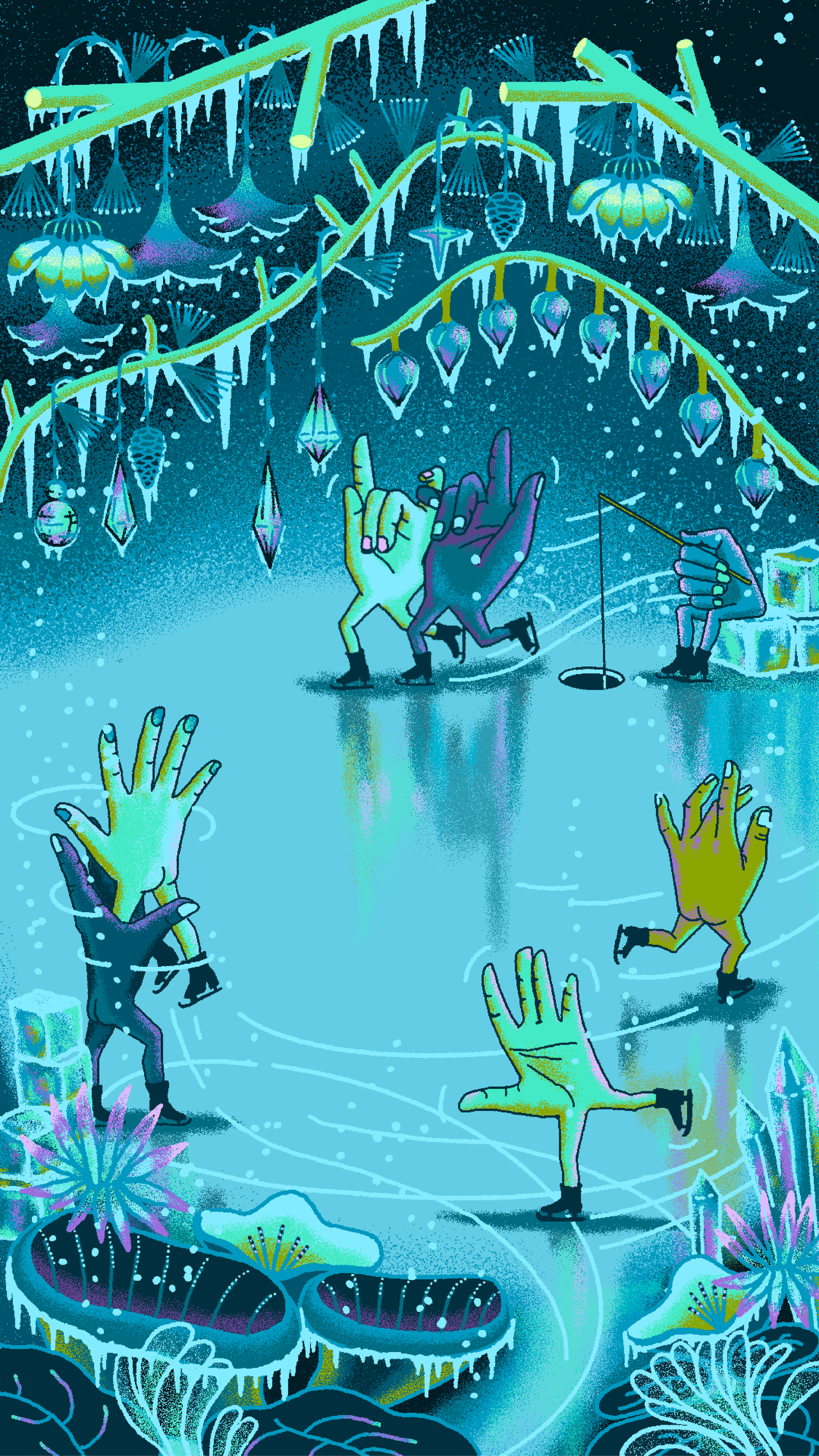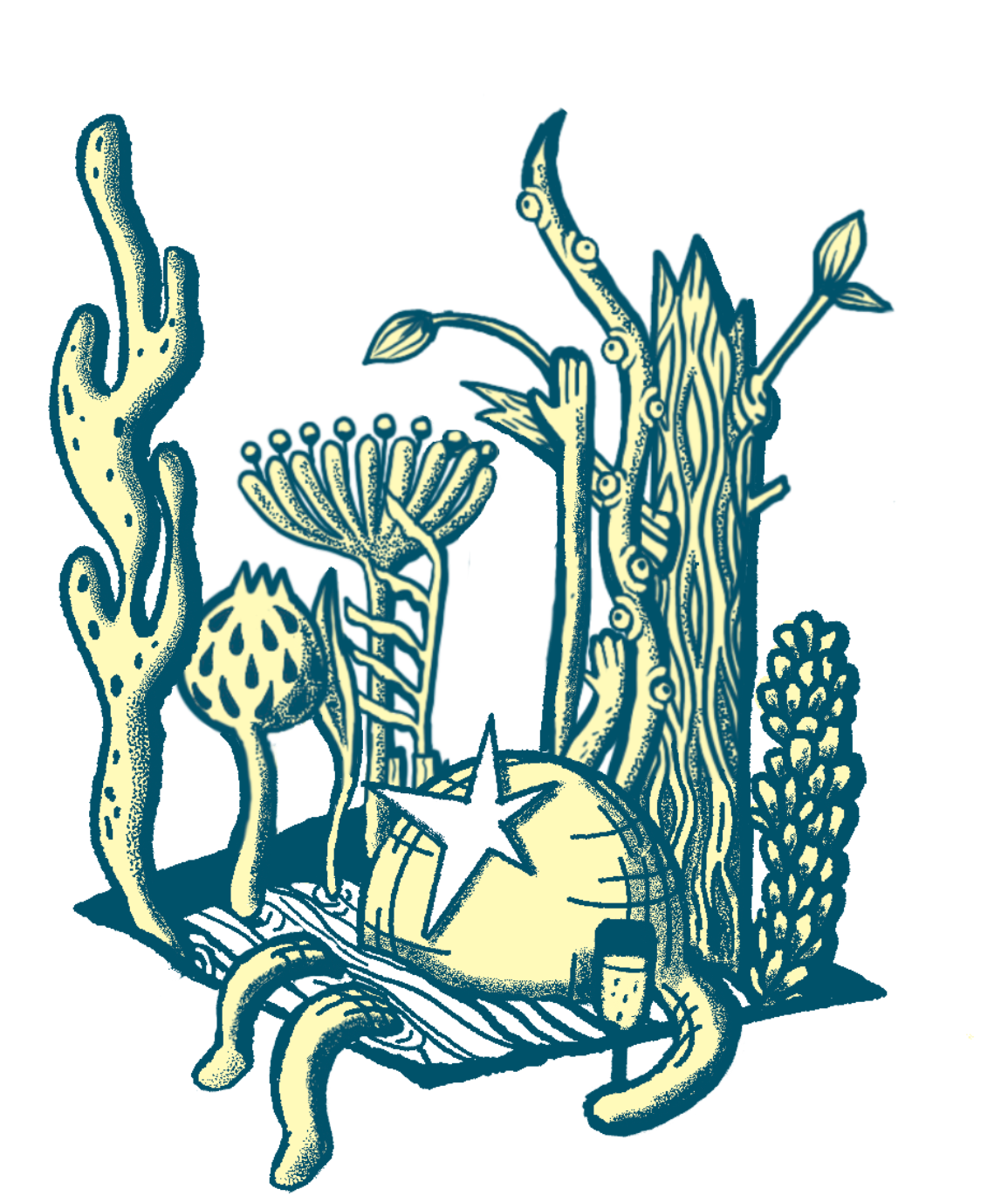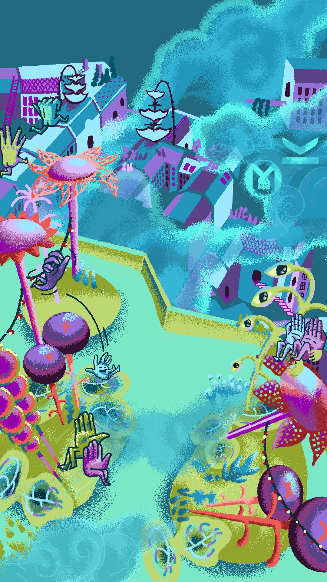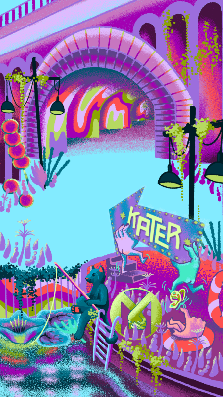 Fräns’ Illustrationen sind knallig & wimmelig. In verspulten Landschaften spielen noch nie gesehen Wesen und Pflanzen das Entdeck-mich-Spiel mit den Betrachter*innen.