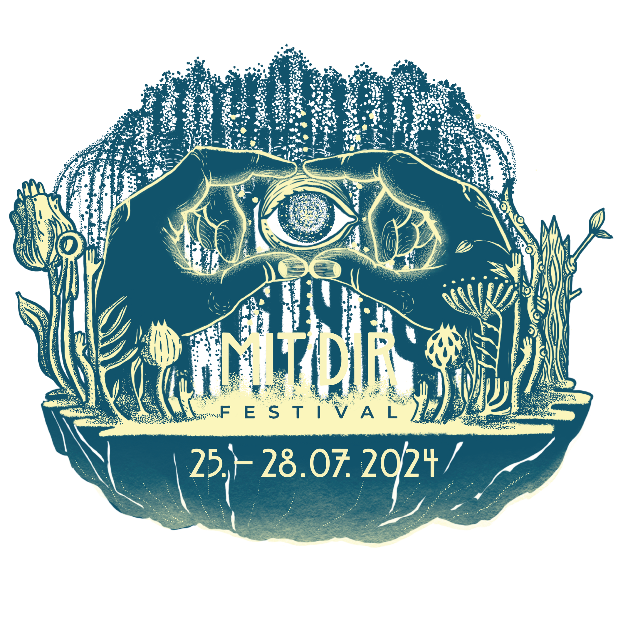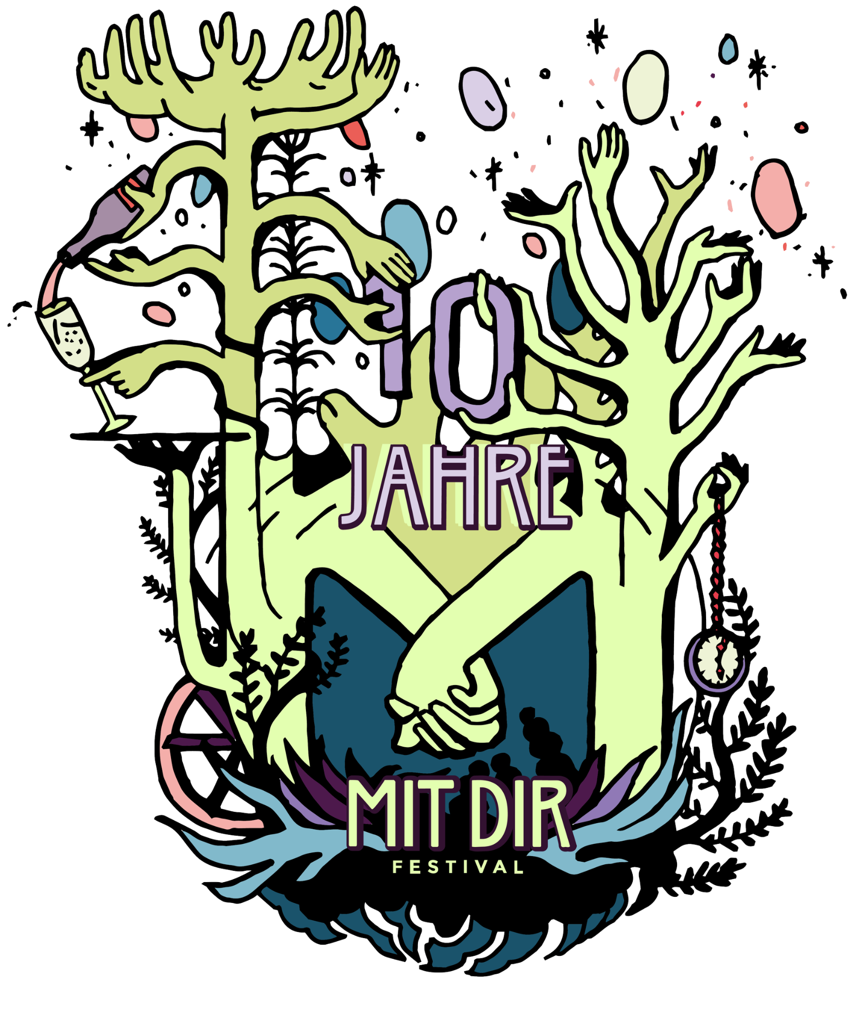 Unter diesem Motto gestaltet Studio Fräns seit 2024 das alljährliche Artwork und die gesamte illustrierte Welt für das detailverliebte MIT DIR Festival in Klingemühle. Was mit einem Aufruf nach Maler✶innen begann, hat sich zu einer fantastischen Kollaboration entwickelt, die aus gemeinsamen Traumwelten entspringt und sich Jahr für Jahr erneut in Schale wirft.